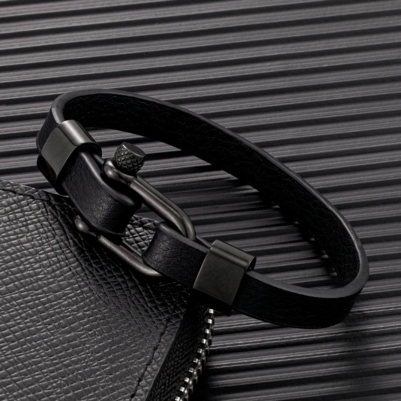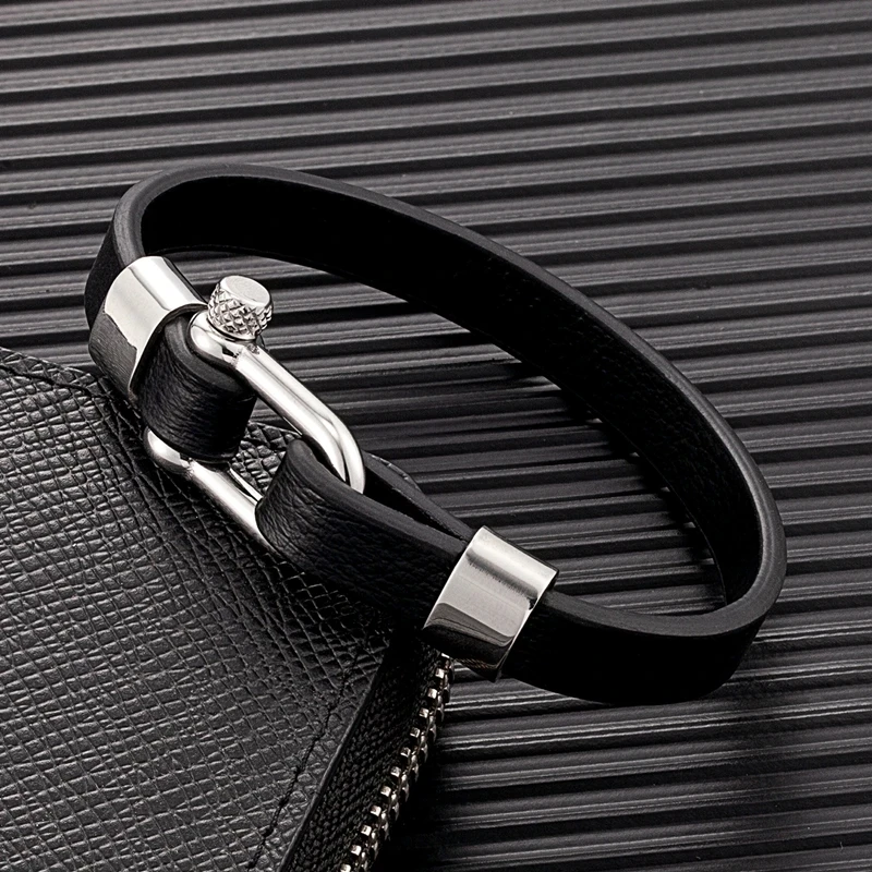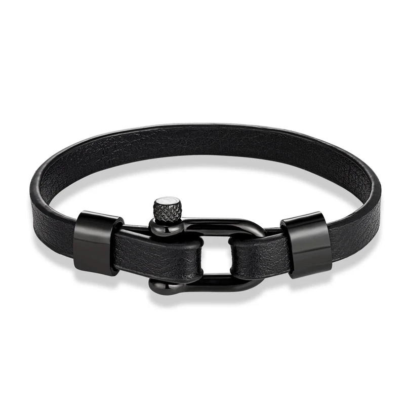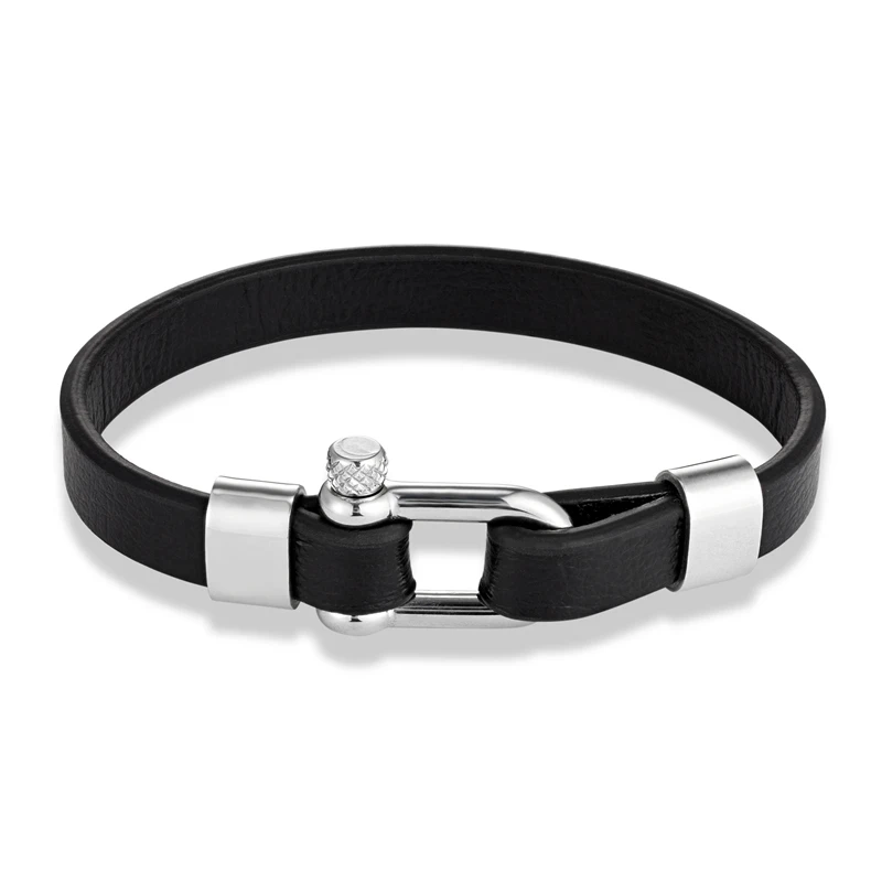 This bracelet merges raw industrial elements with modern elegance through a U-shaped shackle clasp, secured by a precision screw pin.