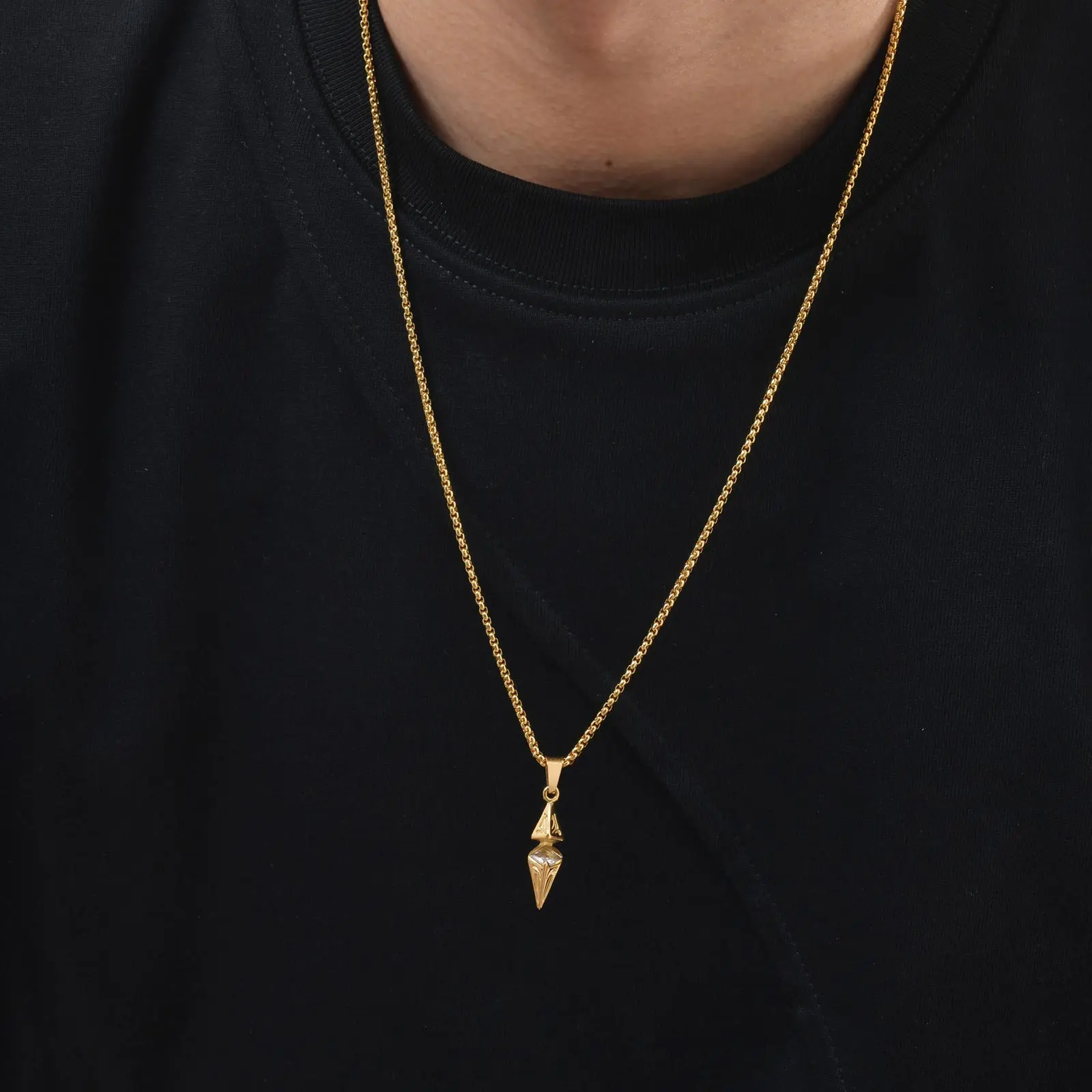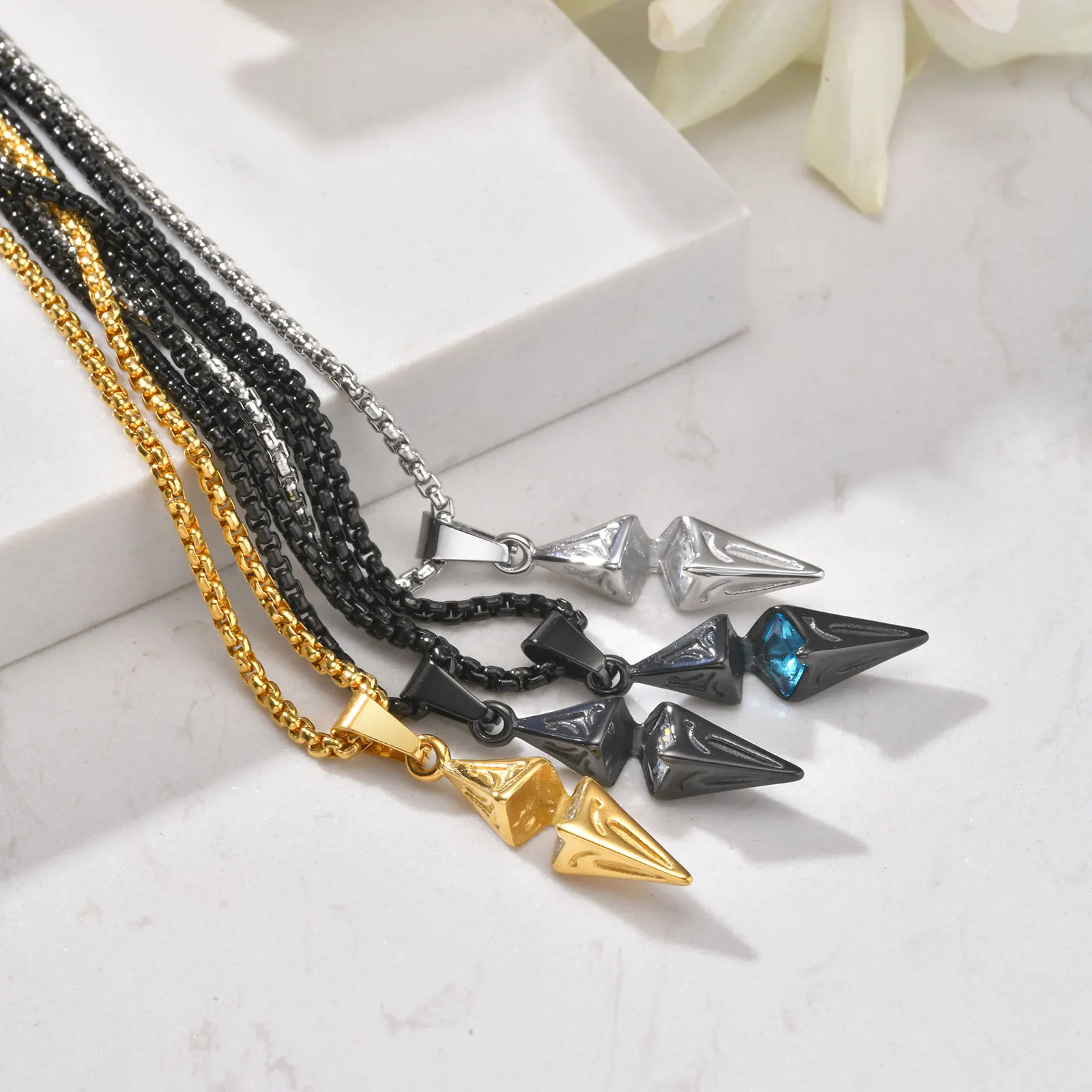 This double-rhombus pendant features a sharp, 3D design accented with a glowing zircon core. Cast in high-grade stainless steel, it’s a statement of modern power — geometric, clean, and unmistakably stylish. Unisex and versatile for those who walk on the edge.