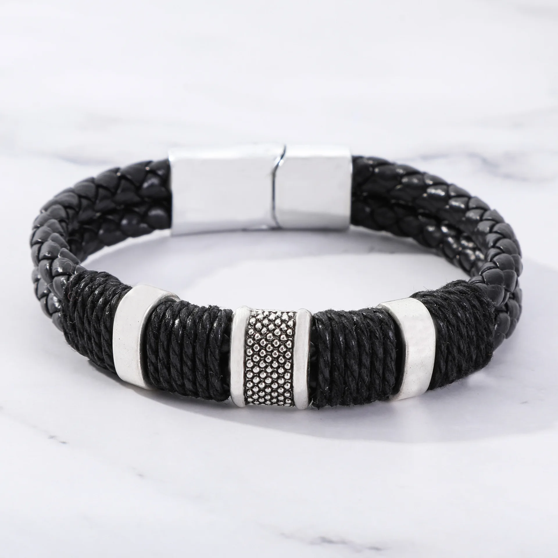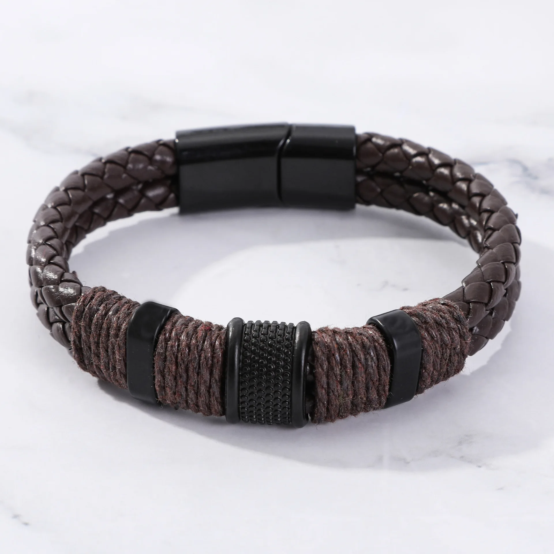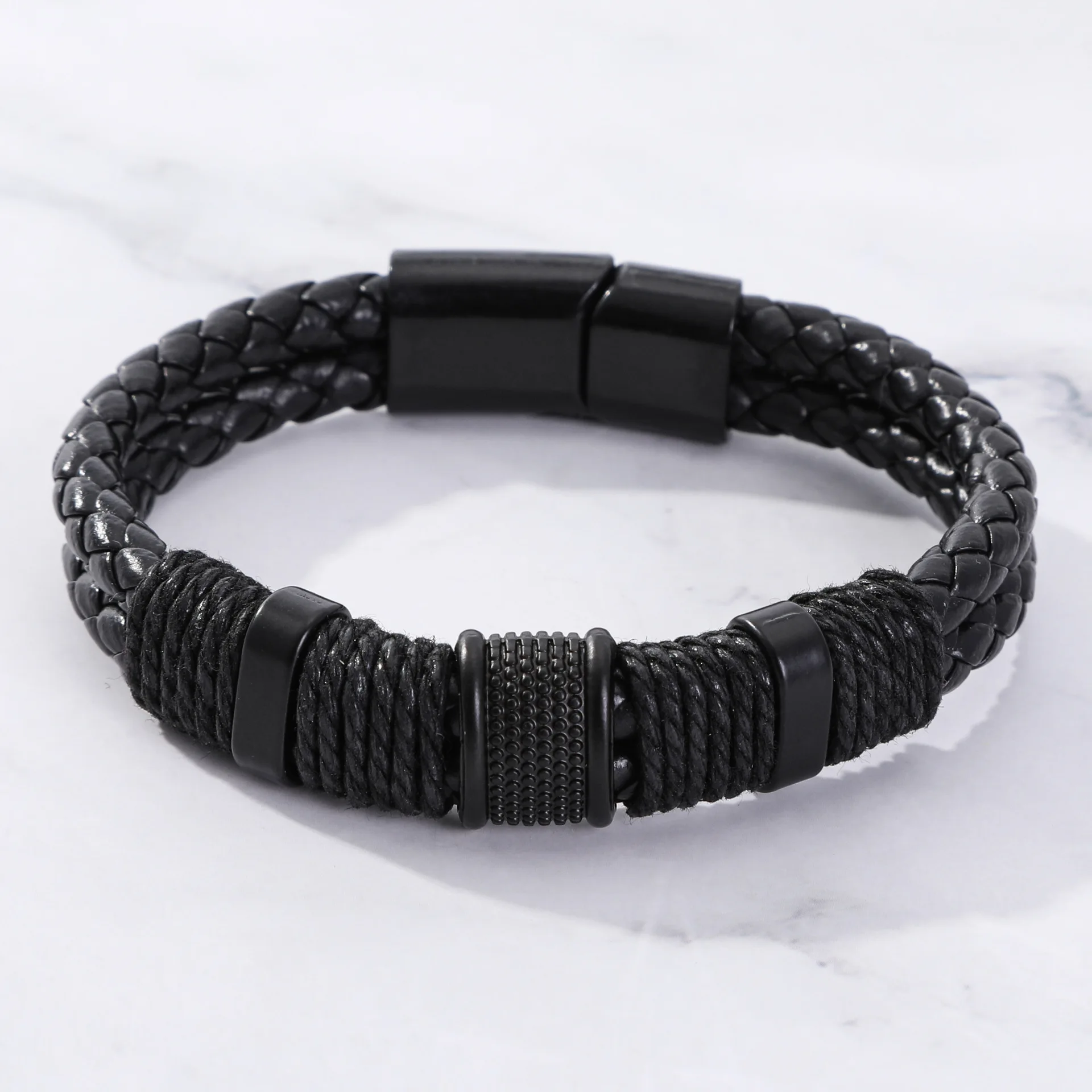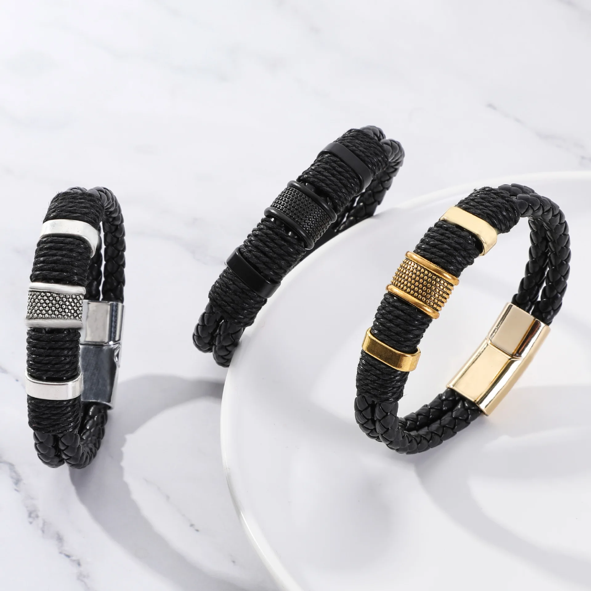 Elevate your style with this bold yet refined bracelet. Featuring a double-layer braided leather design and sleek stainless steel accents in black, silver, or gold tones — a perfect blend of rugged charm and luxury appeal. Ideal for everyday wear or special occasions.