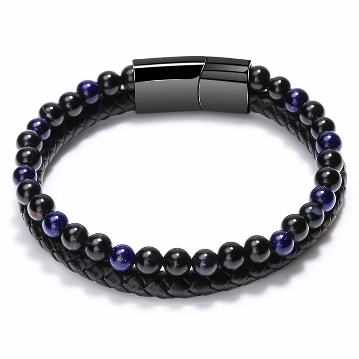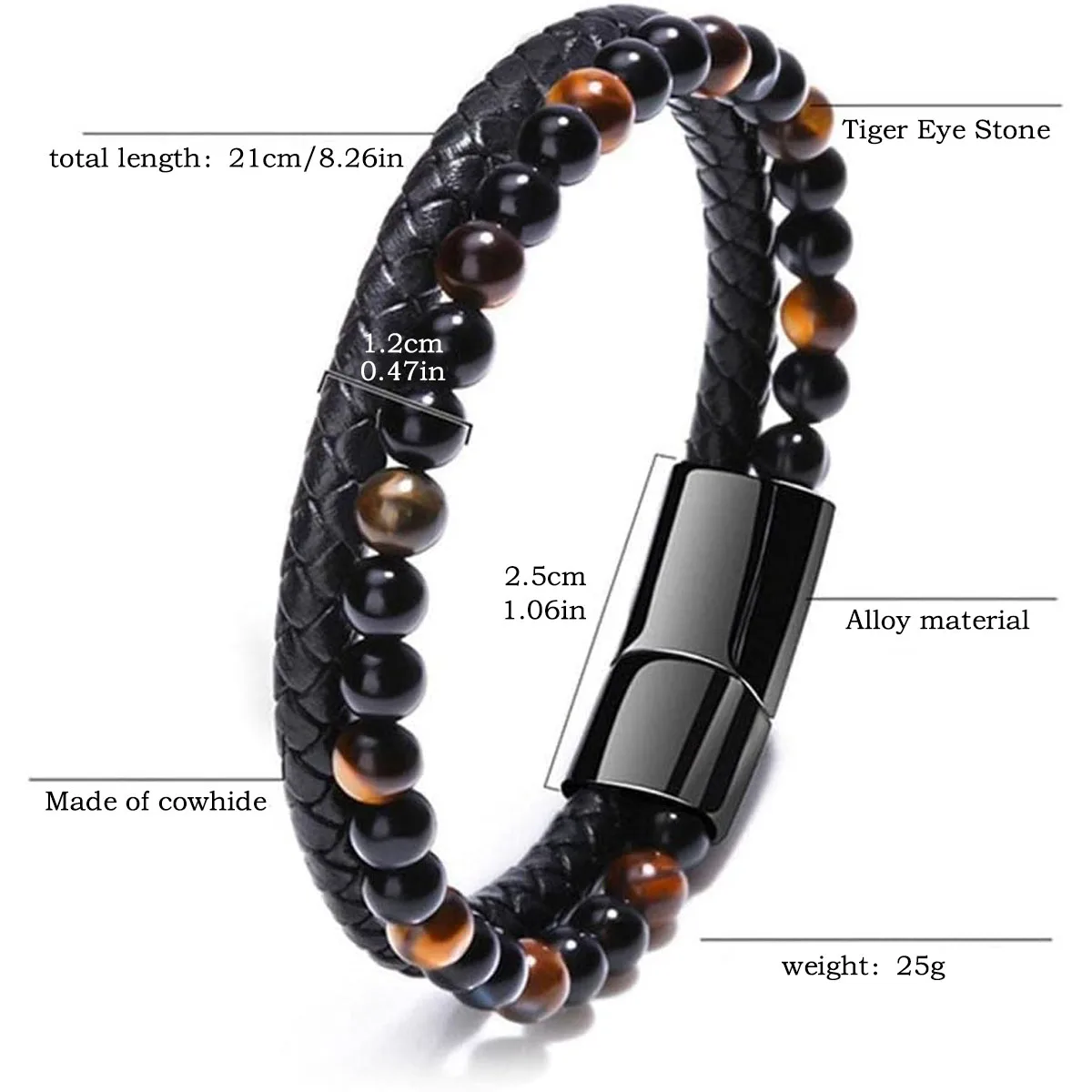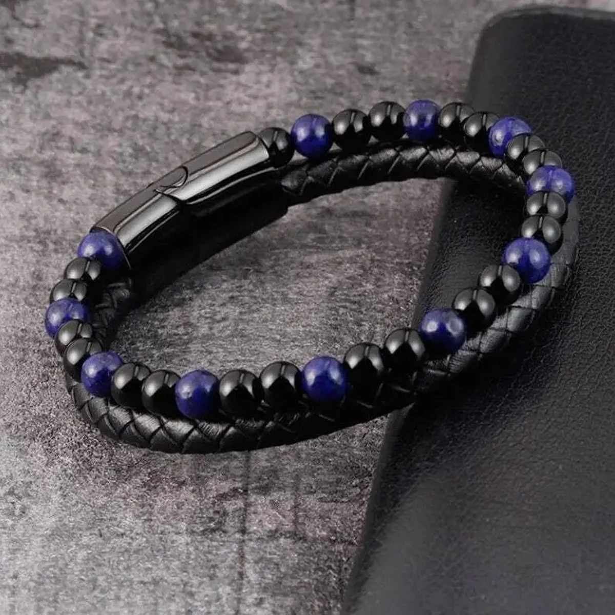 This dual-layer bracelet features a fusion of natural stone beads and braided faux leather, secured by a matte black magnetic clasp. Whether you seek grounding energy or a stylish accent, this piece delivers both — with quiet strength.